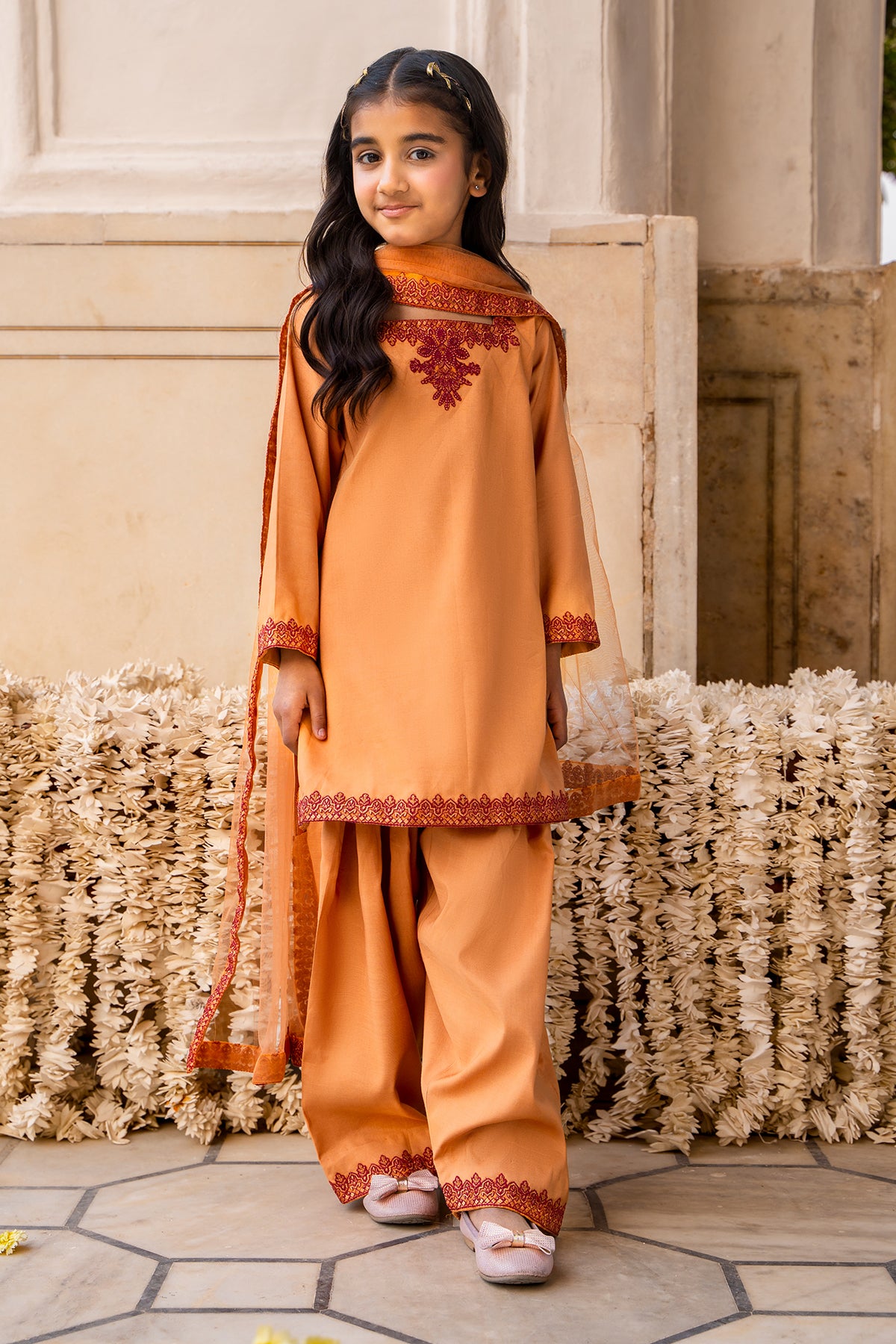 A timeless ensemble crafted in raw silk, this elegant shirt and shalwar set is rendered in a soft mustard hue. The shirt features a classic straight silhouette, enhanced with intricate contrast embroidery along the neckline, sleeves, and hem, adding depth and refined detailing. The statement motif on the front lends a subtle festive charm.