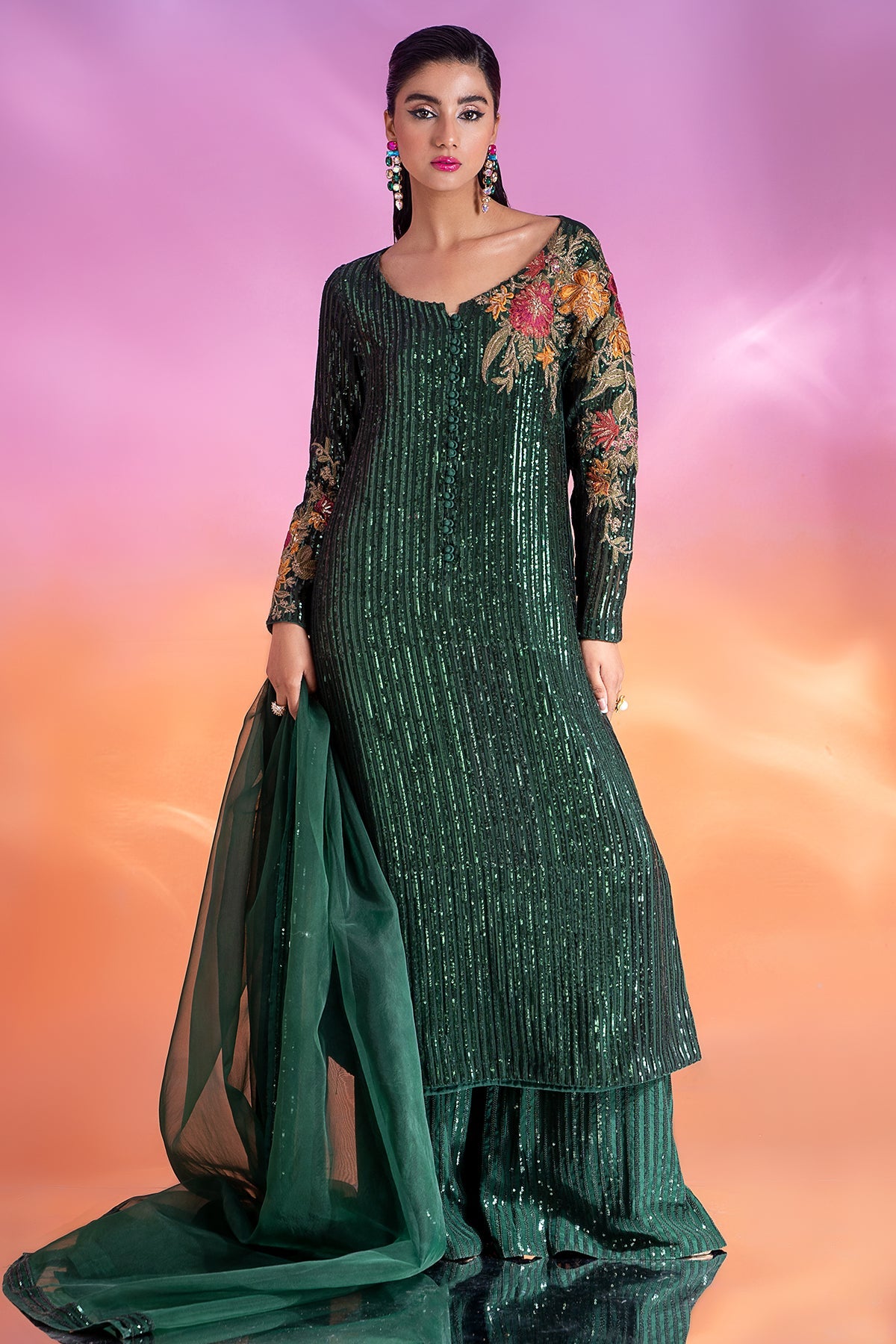 Shirt: Viscose Chiffon Shirt with embroidered frontjall,embroidered neck motifs,embroidered sleeves jall and embroidered sleeves motifs. Embellished with Patch Work. Finished with Stitching detail. Inner: Raw Silk Inner Shirt. Trouser: Raw Silk embroidered trouser with trouser inner. Finished with Stitching detail. Dupatta: Organza dupatta with embroidered dupatta pallu lace. |
