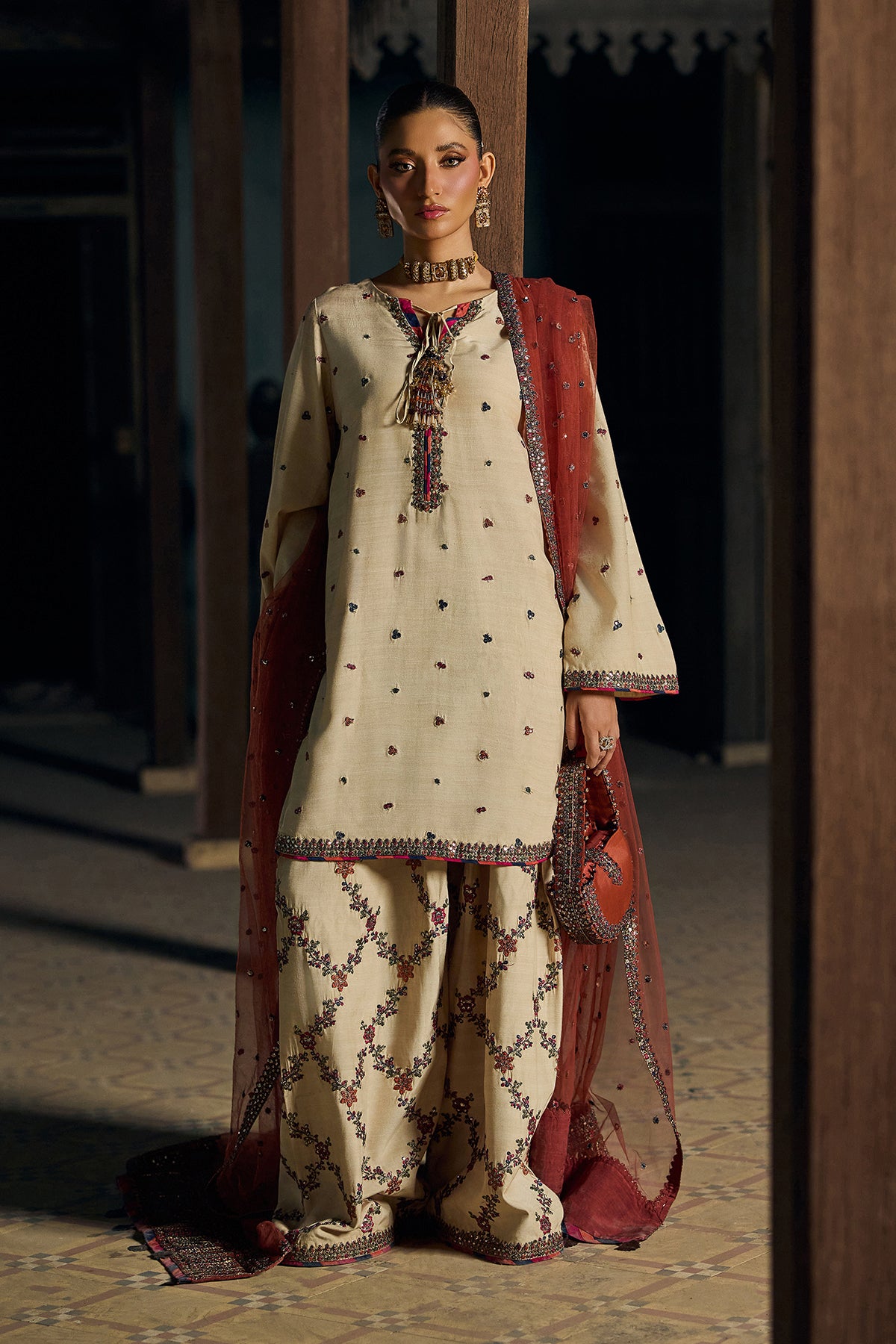 Paired with a matching shalwaar, designed with an all-over embroidered crisscross lattice pattern filled with delicate floral motifs. The shalwaar is completed with a detailed embroidered hem border, enhancing the overall traditional elegance.