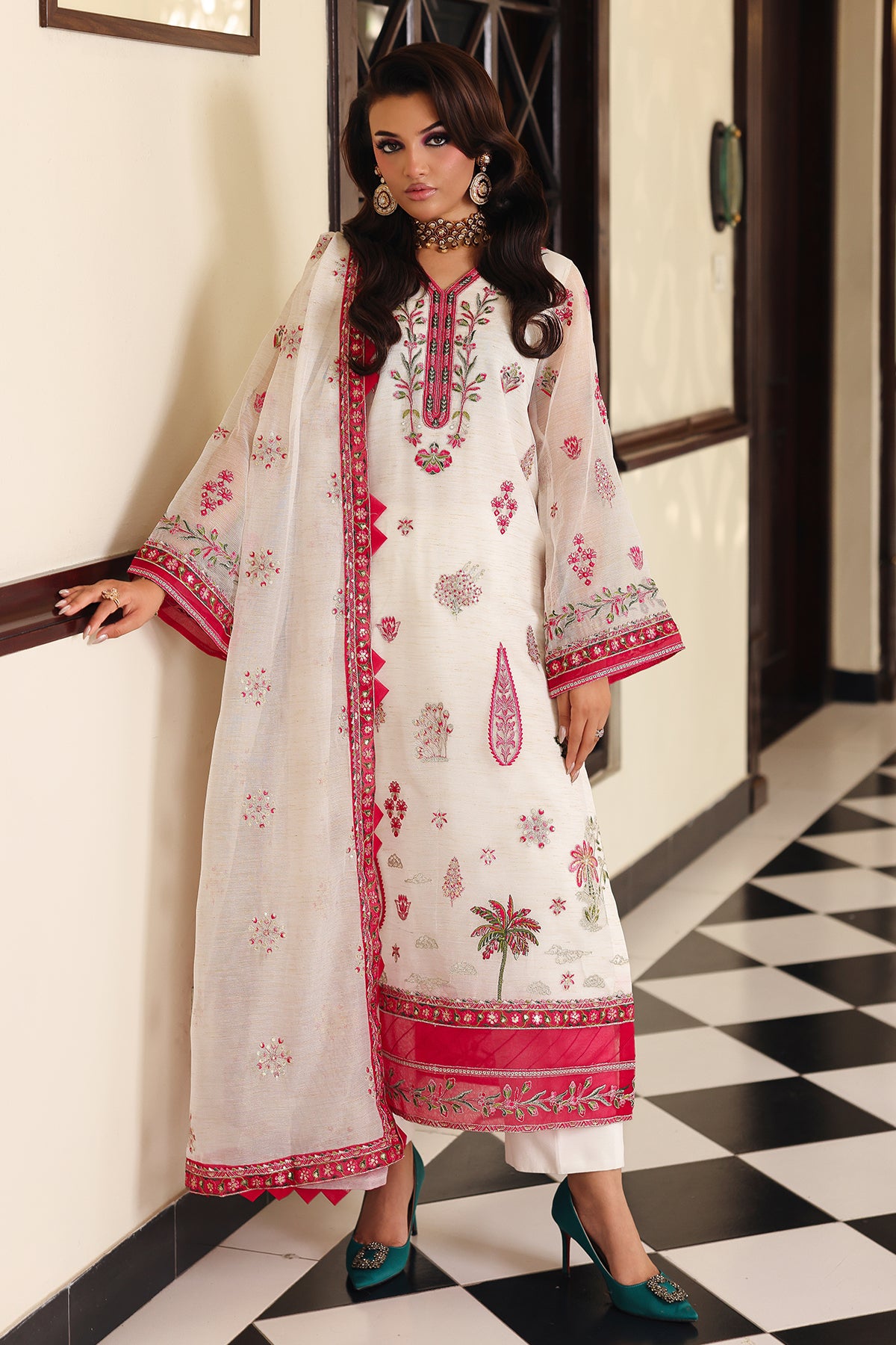 White straight-cut shirt adorned with delicate pink and green floral embroidery paired with white trousers. Finished with a matching organza dupatta featuring subtle embroidered motifs for a graceful and festive look.