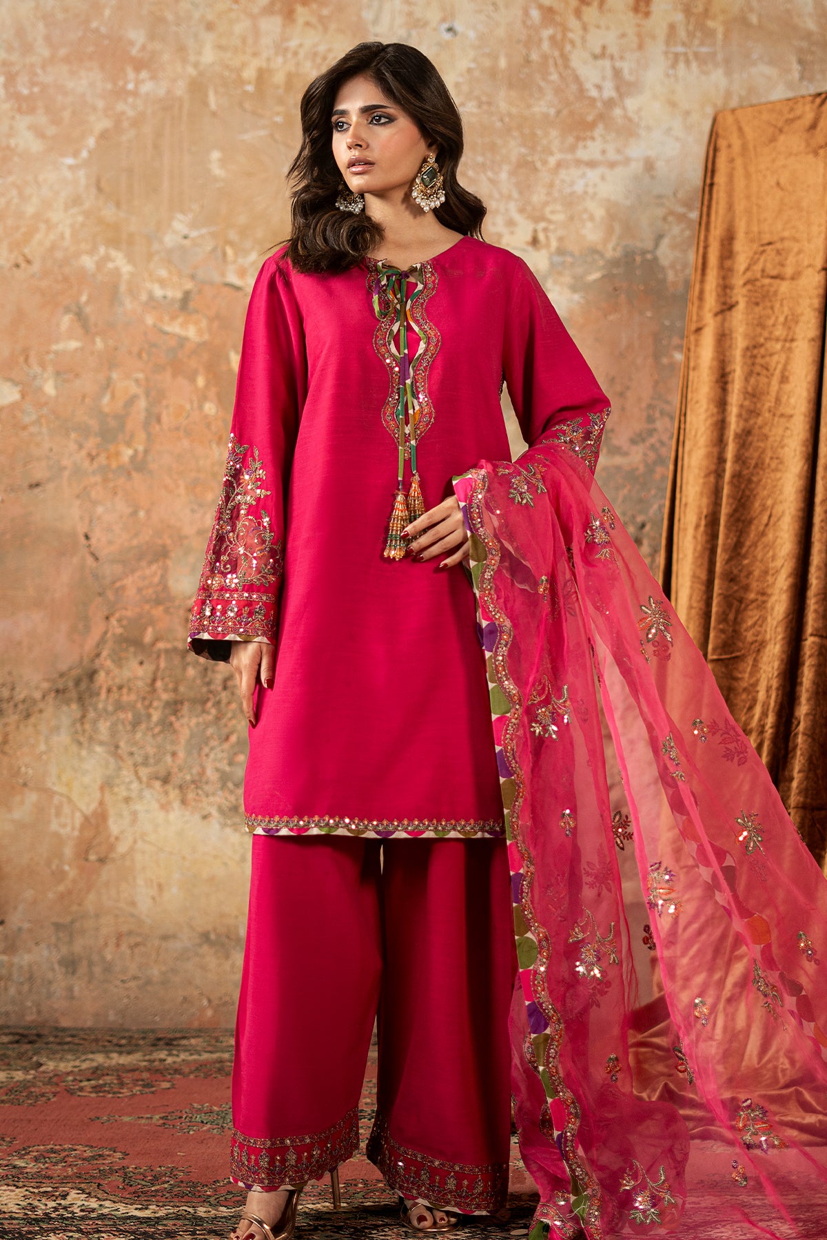 Paired with a coordinated raw silk shalwar adorned with embroidered borders, the outfit creates a balanced and refined look. The look is completed with a sheer organza dupatta beautifully embroidered with scattered sequins and intricate tilla and resham motifs, finished with an ornate embroidered border for added elegance and movement.