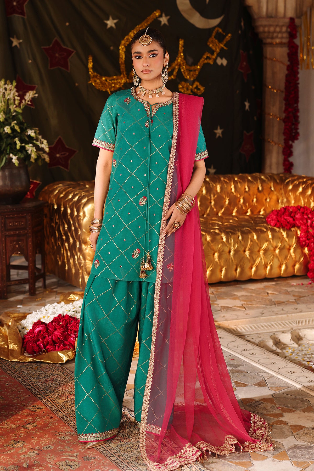 Shirt raw silk with foil printed with trouser raw silk with dupatta poly net