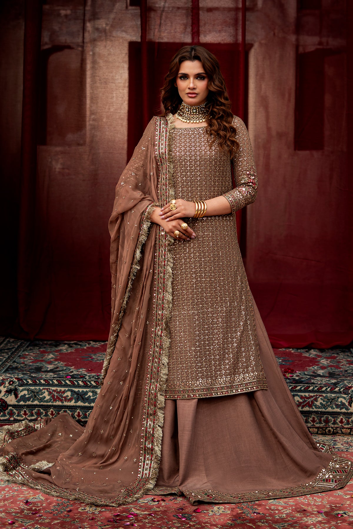 Long chiffon shirt paired with a raw silk sharara in a soft festive tone. The shirt features an all-over sequin embroidered surface with heavily detailed borders on the neckline, sleeves, and hem, adorned with sequins, tilla, and multicolor resham embroidery. The matching sharara is finished with a coordinating embroidered border. It is complemented by a chiffon dupatta with sequin spray and richly worked borders featuring sequins, tilla, and multicolor resham embroidery, finished with kiran lace for an elegant, occasion-ready look.