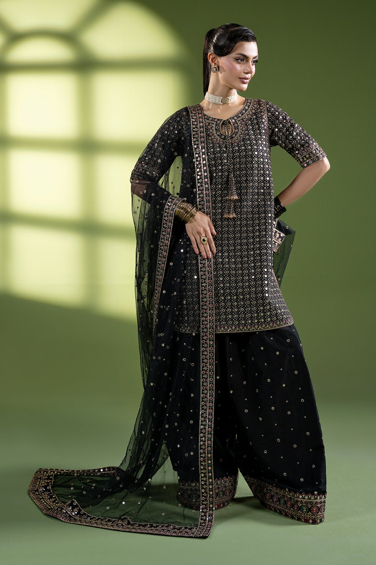 Raw silk shirt paired with a matching raw silk shalwar, crafted in a rich festive palette. The shirt features an all over geometrical sequin and tilla embroidered pattern, enhanced with multicolor resham embroidery on the neckline, sides, hem and sleeves. It is designed with a keyhole neckline, finished with crystal tassels hanging from the opening for a statement detail. The coordinating raw silk shalwar is finished with a sequin and tilla pattern and a multicolor resham embroidered border. The ensemble is completed with a sheer net dupatta, detailed with a sequin and tilla border and multicolor resham embroidery along with all over dense sequin and tilla spray adding an elegant and vibrant finish.