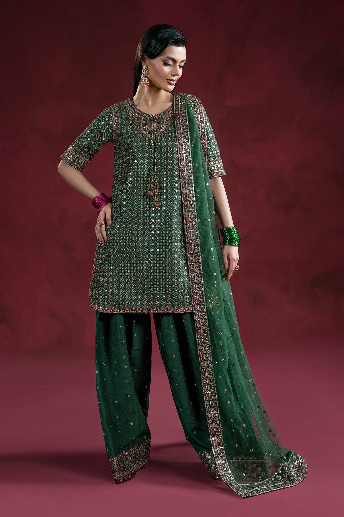 Raw silk shirt paired with a matching raw silk shalwar, crafted in a rich festive palette. The shirt features an all over geometrical sequin and tilla embroidered pattern, enhanced with multicolor resham embroidery on the neckline, sides, hem and sleeves. It is designed with a keyhole neckline, finished with crystal tassels hanging from the opening for a statement detail. The coordinating raw silk shalwar is finished with a sequin and tilla pattern and a multicolor resham embroidered border. The ensemble is completed with a sheer net dupatta, detailed with a sequin and tilla border and multicolor resham embroidery along with all over dense sequin and tilla spray adding an elegant and vibrant finish.