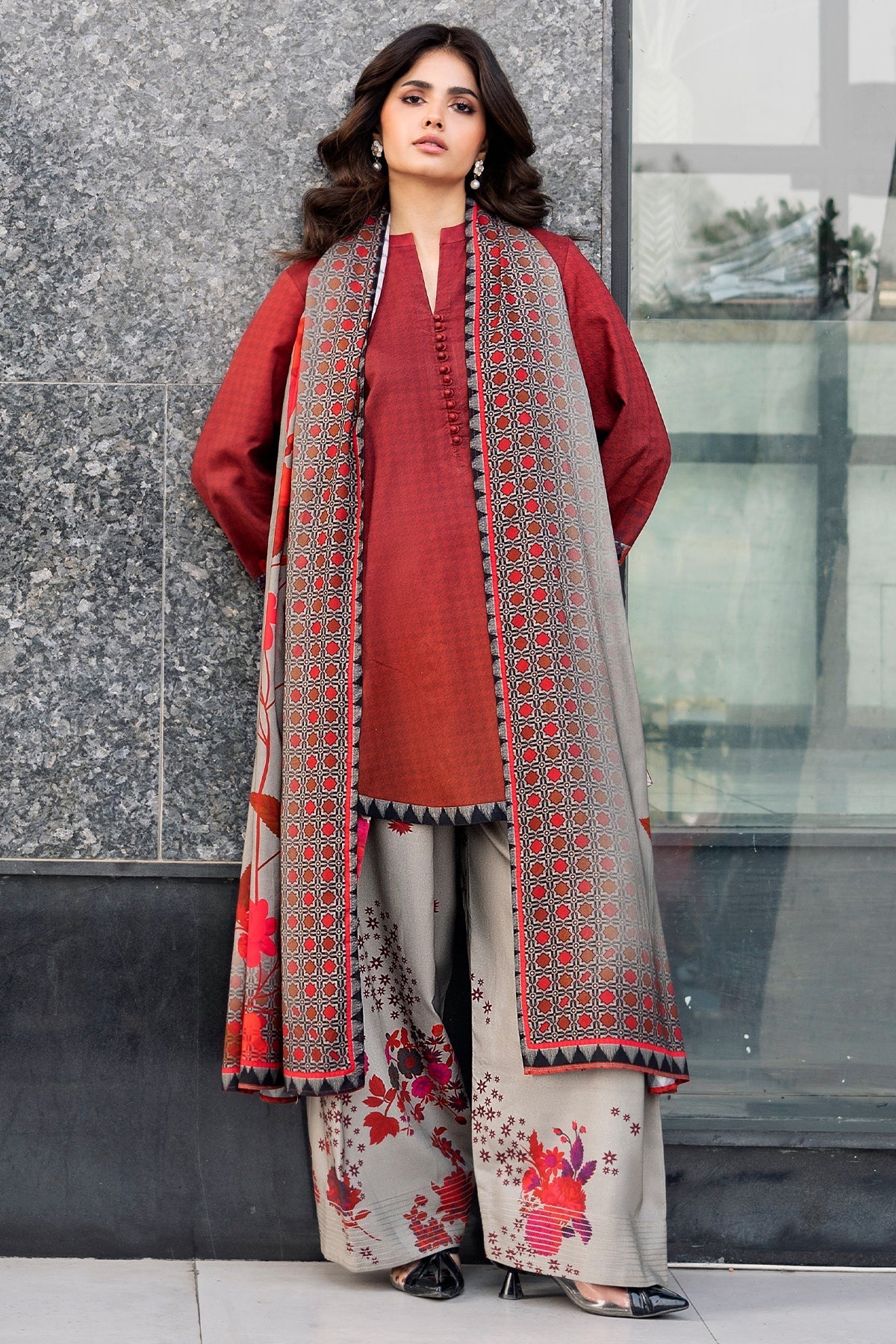 3pc printed set with a short shirt having a band neckline and buttons paired with trousers having stitching details and printed duppata.