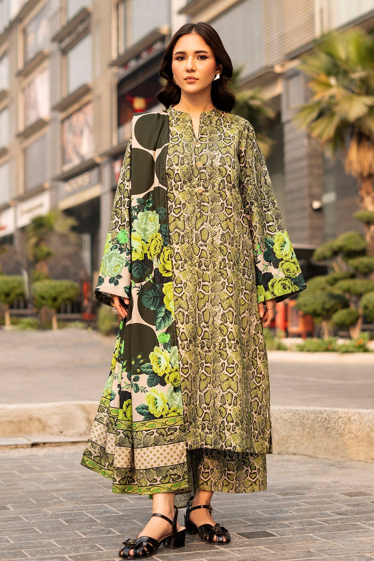 3pc printed set with a long shirt and culottes paired with a digital printed duppata.