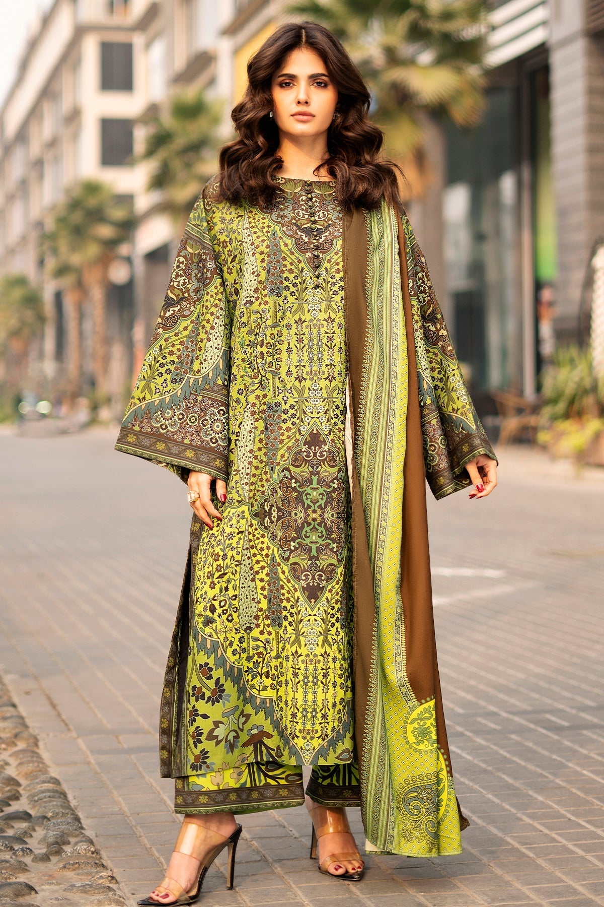 3pc printed set with a long shirt with buttons and culottes paired with a digital printed duppata.