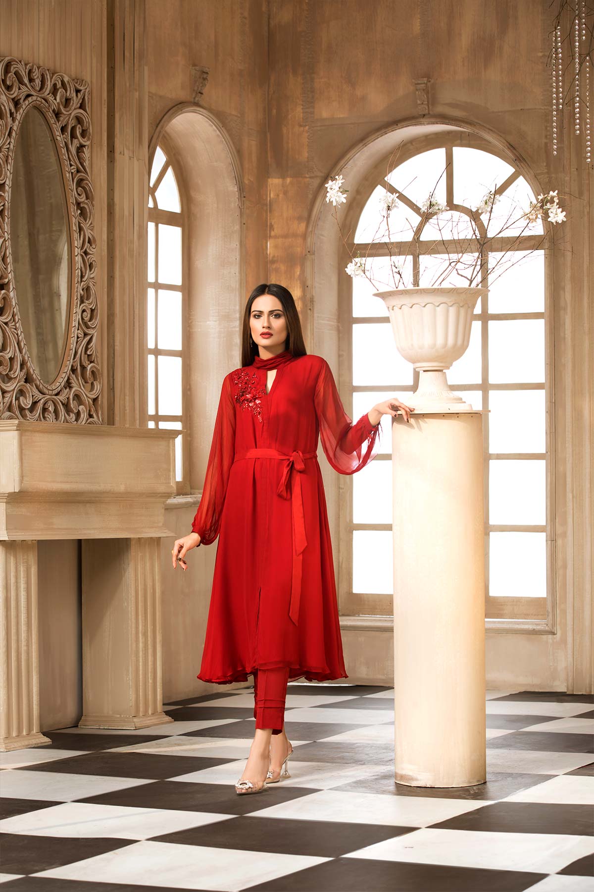 Chiffon Front/Back And Sleeve Finished With Embellished Motif On Front Top Panels