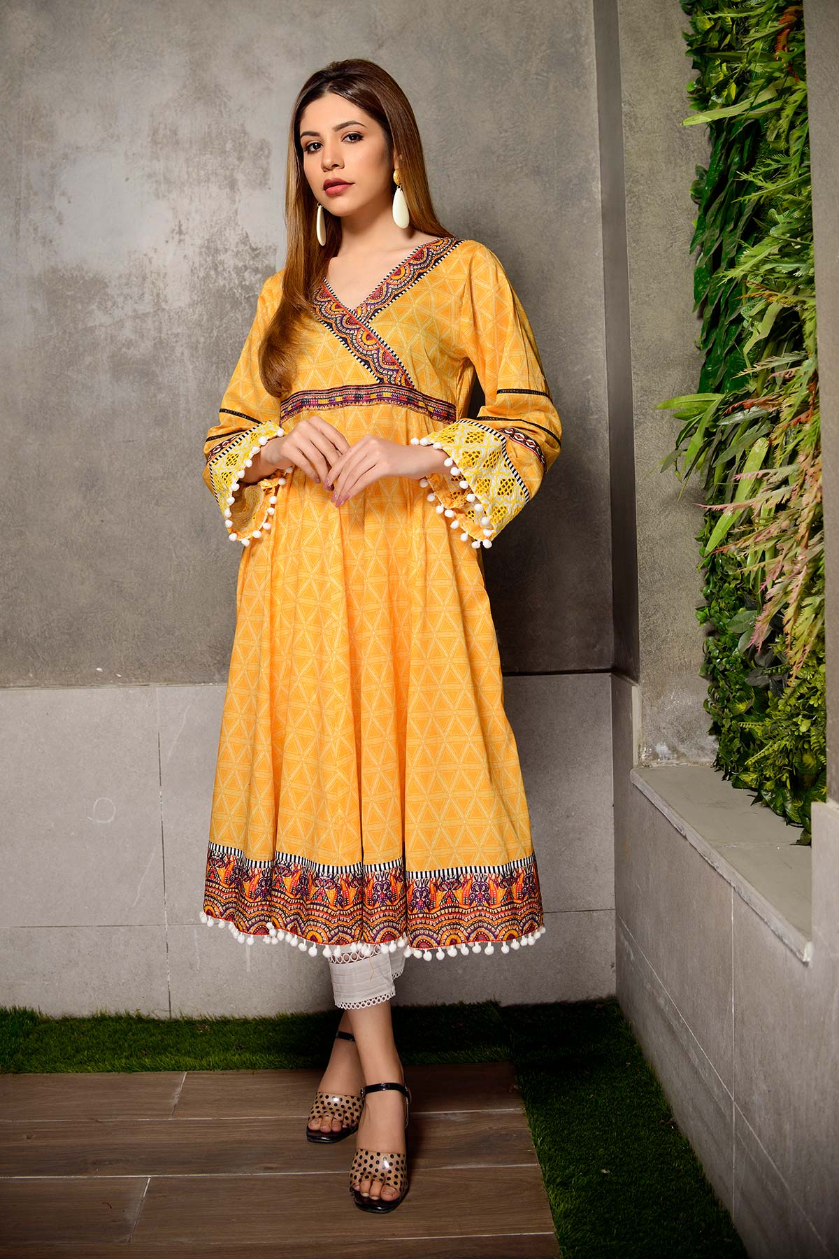 Digital Printed Lawn Front back and sleeve's long Frock Finished with Lace,Chiffli Emb On Sleeve's and Stitching Details.
