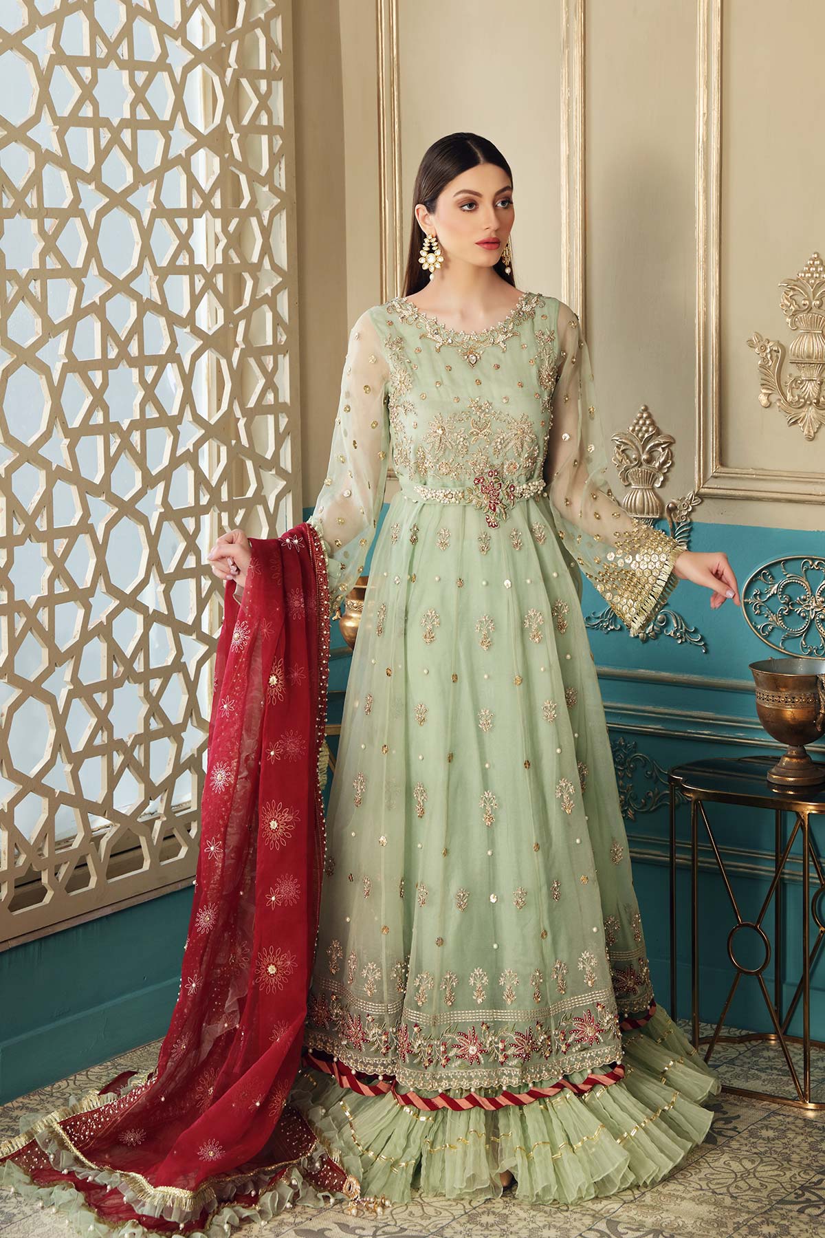 Embroidered Organza Front and Sleeves with adda work Kiran laces and stitching details. Organza plain back with stitching details and preals attached on back Neck Line. Resham lawn attached inner.