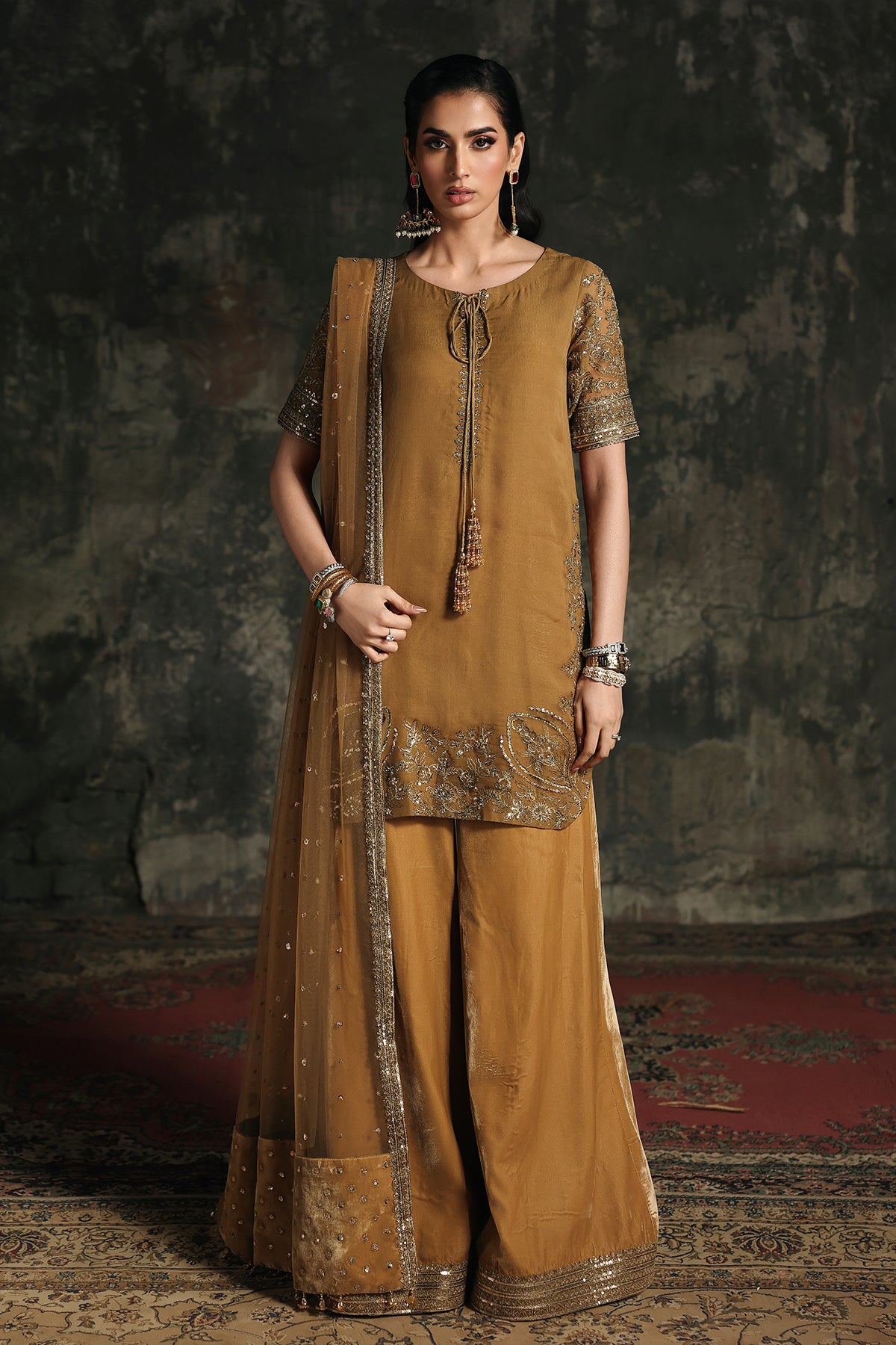 Paired with a matching coffee-colored velvet sharara, crafted with a beautiful, voluminous flare that adds drama and elegance.