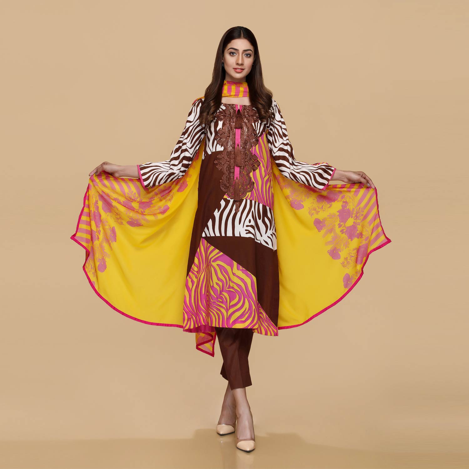 Have fun loading your closet with the best blend of the digital animal prints, stroke of lines and bright colors to create looks that are refreshing and unique. Brown with the lively yellow.